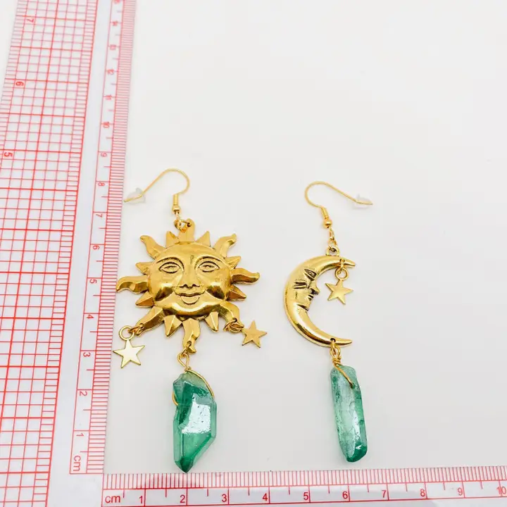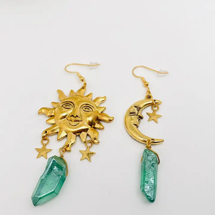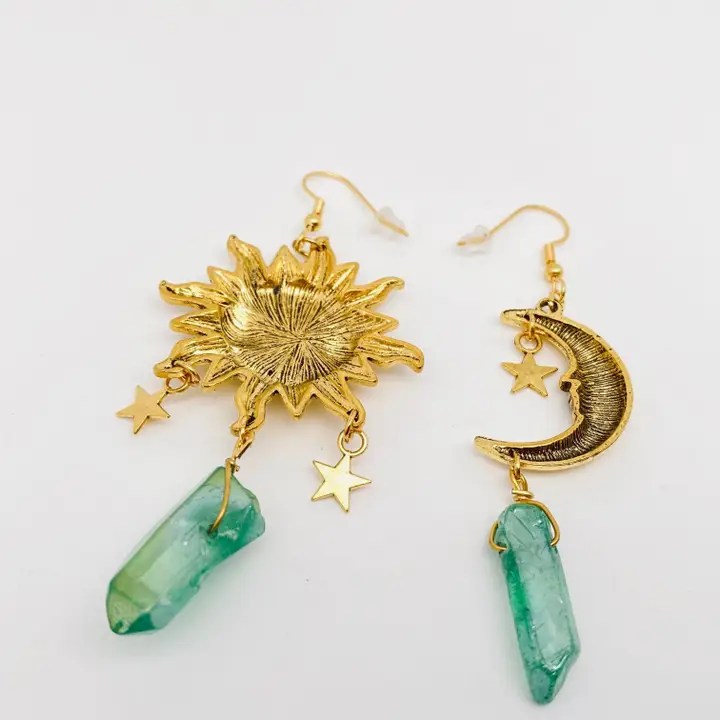 Asymmetric Sun and Moon Green Crystal Pendant Earrings – Ms