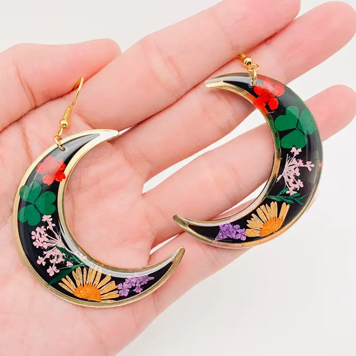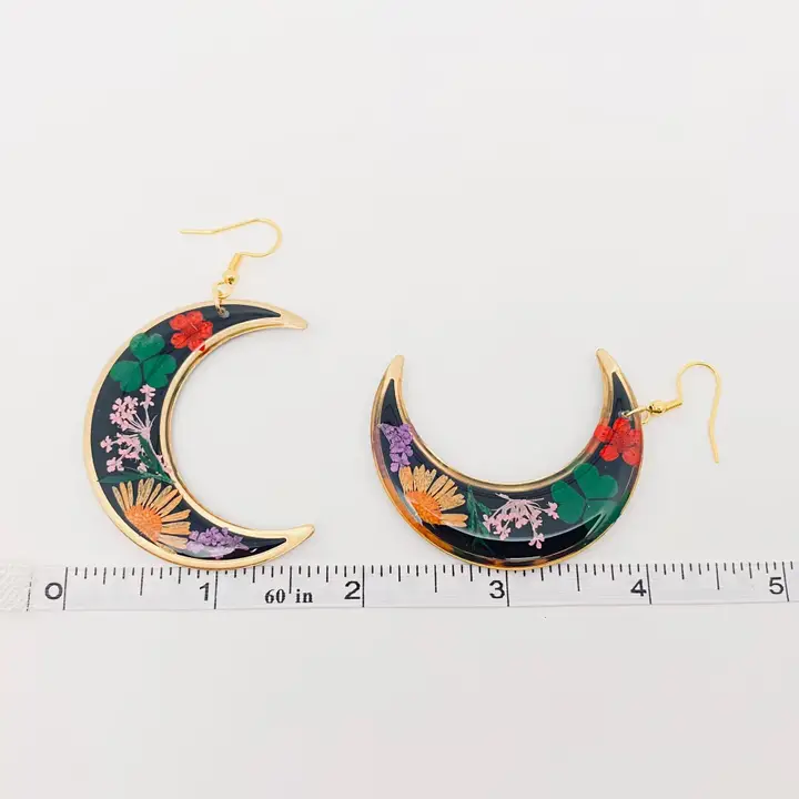 Dried Flowers Floral Large Black Crescent Earrings -Pdf/Ms quantity